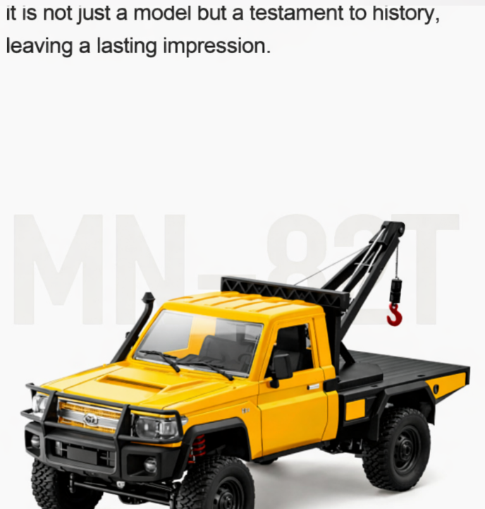 The MN82T Tow Truck RC is a 1/12 scale, 4WD Remote Controlled pick-up truck designed as a recovery vehicle. It is an upgraded version of the standard MN-82, featuring a working crane and a more comprehensive lighting system. With a focus on realism and beginner-friendly crawling, the MN82T is a part of a budget friend RC experience.