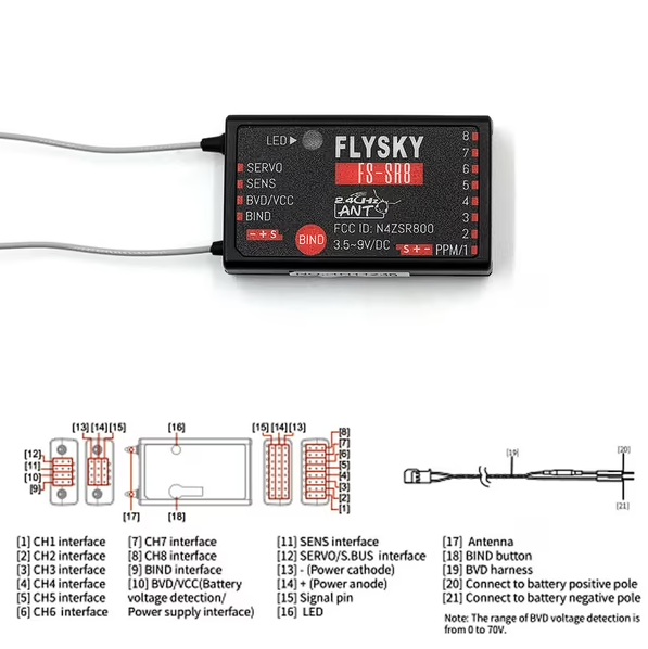 The FlySky FS-SR8 is a high-performance 2.4GHz 8-channel ANT-protocol receiver with dual antennas, wide voltage input, and support for PWM, PPM, i-BUS and S.BUS output—ideal for advanced RC airplanes, helicopters, gliders or multi-axis builds.